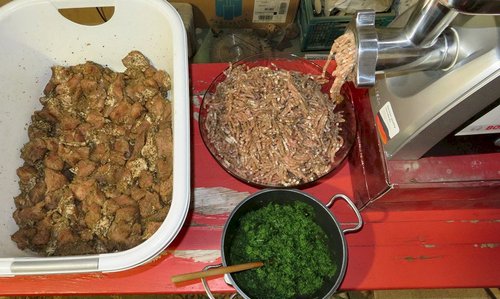 Foto: Fertig sind die groben Bratwürste und die grünen Bärlauchbratwürste. Insgesamt 12 Kilo hat Michael erzeugt.
