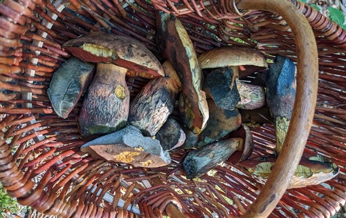 Foto rechts: Nach der infolge Trockenheit ausgefallenen Morchelsaison in Südbaden sieht Oliver mit diesen drei Flockenstieligen Hexenröhrlingen, gefunden im Landkreis Emmendingen, endlich den Beginn der Röhrlingssaison.