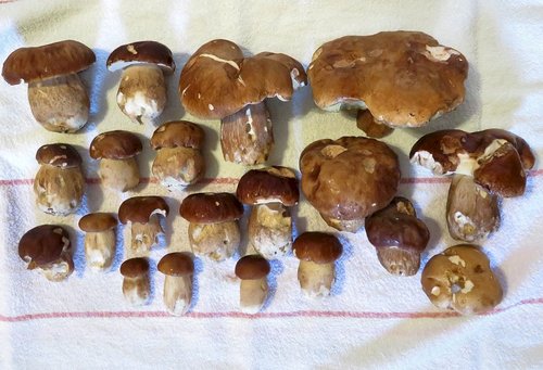 Foto: Mit 20 Exemplaren ist dies der erste uns gemeldete größere Fund von Sommersteinpilzen in diesem Jahr. Meister Michael hat dafür in der Region Kronau alle seine Plätze abgeklappert. Die Spuren der Schnecken halten sich in Grenzen.