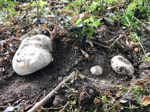 Foto: Hier wird der Charakter der Stadtchampignons als Erdschieber deutlich. Diese Pilzart benötigt zu ihrem Wachstum kräftigen Druck von oben, gegen den sich die Fruchtkörper mit äußerster Kraft emporarbeiten, weshalb sie immer hartes Fleisch und fast immer verschmutzte Hüte haben. Mühelos durchbrechen sie sogar Asphalt, siehe hier, Tageseintrag vom 21. September 2017.