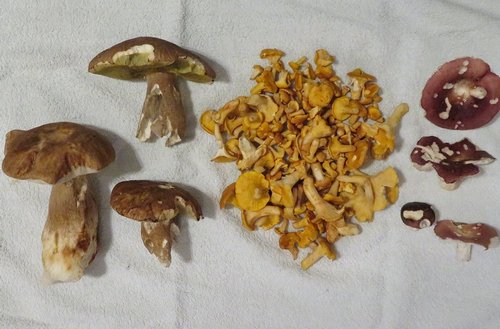 Voll wurde meine Tasche leider nicht ganz. Dafür gesellten sich aber zu den Pfiffers noch ein paar Speisetäublinge (z. B. 2. Foto rechts) und drei Sommersteinpilze. Letztere konnte ich aus einem aufgeforsteten Waldstück retten. Vor den Forstarbeiten war es noch reich an Sommersteinpilzen. Am geschnittenen Pilz (1. Foto rechts) ist die sehr gute Qualität der Steinpilze gut zu erkennen.