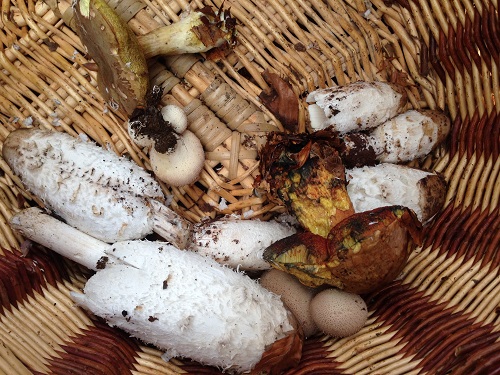 Foto: Sechs Schopftintlinge, fünf Birnenstäublinge, ein Flockenstieliger Hexenröhrling sowie vermutlich eine verblasste Ziegenlippe (Filzröhrling) haben den Weg in Olivers Korb gefunden. Auf dem Foto unten sind wohl alternde Gelbstielige Trompetenpfifferlinge zu sehen.