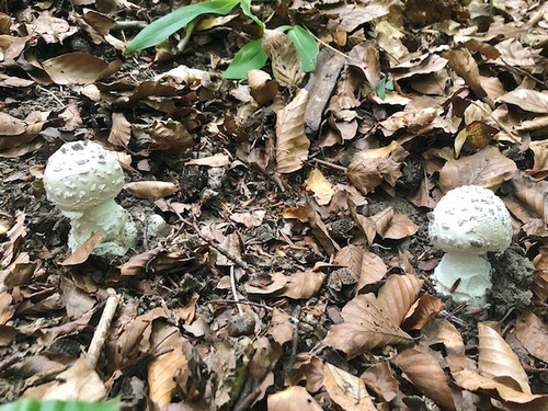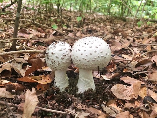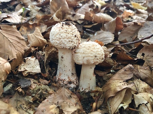 Foto: Zwei Fransige Wulstlinge. Ihre jungen Hüte sind eiförmig bis beinahe kugelrund. Hut, Hüllfetzen und Stiel sind einheitlich licht hellgrau.