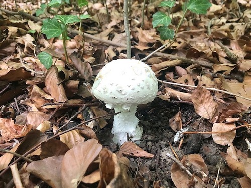 Hinzu kamen dann jeweils noch ein junger Wurzelnder Schleimrübling, ein Fleischroter Speisetäubling, ein Grüngefelderter Täubling und ein Eichenfilzröhrling. Für einen kurzen Augenblick dachte ich, ich hätte sogar meine ersten brauchbaren Perlpilze für das Jahr 2022 gefunden. Aber schon als ich das Laub entfernt hatte und freien Blick auf die Stielbasis bekam, wusste ich schon wieder, wer mich anlächeln wird, wenn ich den Pilz aufschneide. Und so war es dann auch: außen hui, innen pfui.