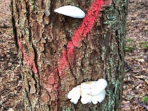 Foto: Hat es der Förster etwa gewusst und deshalb die rote Markierung aufgesprüht? Die Ohrförmigen Seitlinge sind sehr giftig, sollen in Japan zu mehreren Todesfällen geführt haben.
