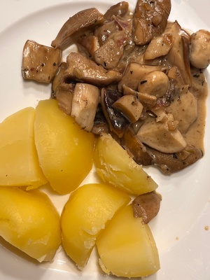 Das 2. Foto - Steinpilze ganz bodenständig zu Salzkartoffeln - erinnert an herrliche Pilzgerichte, die es während der Saison seit Jahren regelmäßig in seinem Hause gibt.