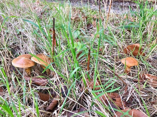 Foto: Wunderschöne Braune Filzröhrlinge. Die Unterscheidungsmerkmale der drei Filzröhrlingsarten - Brauner Filzröhrling, Samtiger Filzröhrling und Ziegenlippe - beschreibt Thomas hier; Tageseintrag vom 26. Juli 2021.