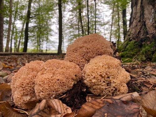 Am Samstag ging es für ein paar Stunden in die Kiefernwälder um Karlsruhe und Mannheim. Es ist ganz egal, wo man dort sucht, überall gibt es die Krausen Glucken. Manchmal wachsen auf wenigen Metern vier oder fünf Stück. Aber es gibt auch Gebiete, in denen keine oder nur ganz wenige wachsen. Man muss also beharrlich sein, dann stößt man auf sie.