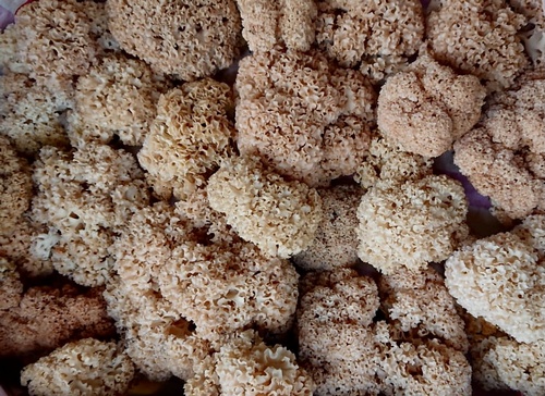 Foto: Hier sind sie im wärmeren Licht zu bewundern. Krause Glucken sind mit ihrem nussigen Geschmack auch hervorragend für die Herstellung eines Pilzwürzpulvers geeignet.