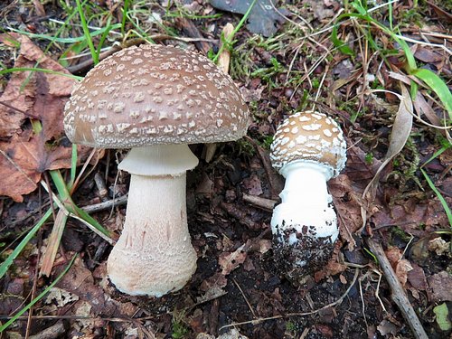 Auf einem Bild zeige ich eine Gegenüberstellung von einem Perlpilz und einem Pantherpilz. Hier kommt gut zur Geltung, wie ähnlich sie sich sehen können.