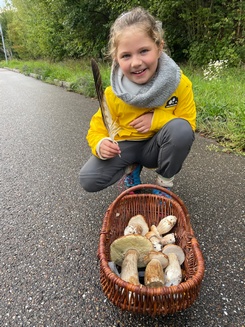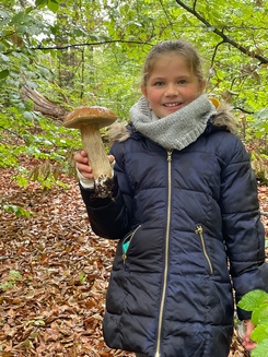 2 Fotos: Fichtensteinpilze, ein Sommersteinpilz und eine Bussardfeder: Merle hat eigentlich alles, was eine Pilzsammlerin so braucht und ist darüber sichtlich frohgemut. Aber auch ein einzelner Steinpilz lässt sie schon lächeln.