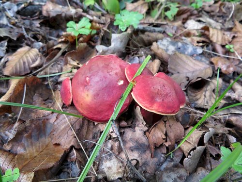 Foto: Die Blutroten (Filz-)Röhrlinge wachsen in Massen. Michael nimmt sie nicht mit, obwohl sie Speisepilze sind.