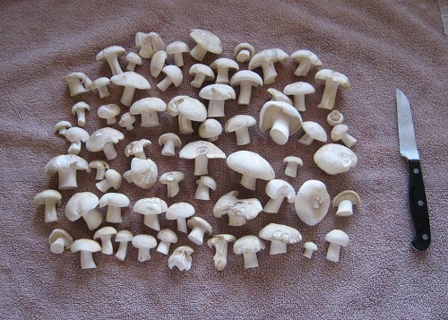 Foto: Schöne Maipilze hat Michael in einem Grünstreifen entlang eines Weges gefunden. Und, wie man sieht, blitzblank geputzt. (2 Fotos © Michael)