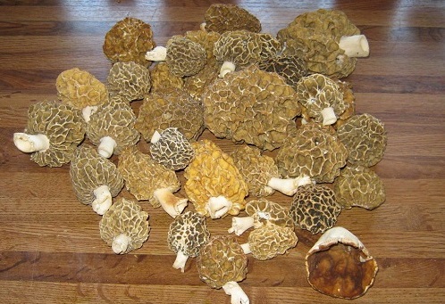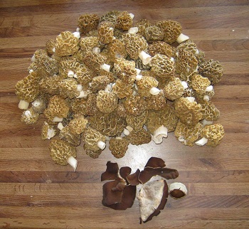 meine Morchelplätze in Bachnähe auf. Aus den kleinen Speisemorcheln waren inzwischen große geworden, die alle mit ins Körbchen durften. Siehe das Foto rechts, auf dem auch Morchelbecherlinge zu sehen sind.