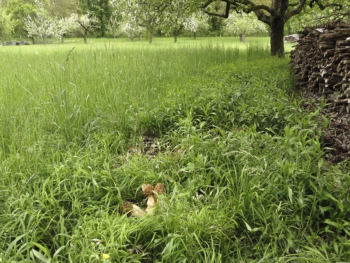 Foto: Diese drei Speisemorchelriesen hatte Ulf wohl bei seinen ersten Visiten am Holzstapel übersehen. Wie schade! Typisch ist, dass sie bei alten Obstbäumen wachsen, bevorzugt bei Apfel- und Birnbäumen.