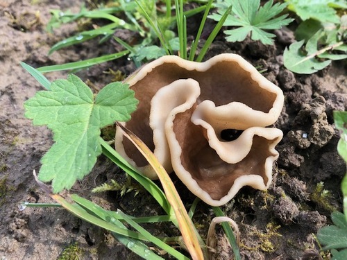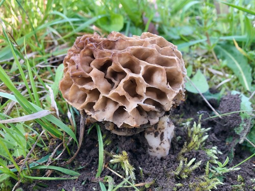 Foto: Auf dem großen Morchelbecherling links sehen wir das Hütchen einer Käppchenmorchel, die erste des Jahres für Thomas.