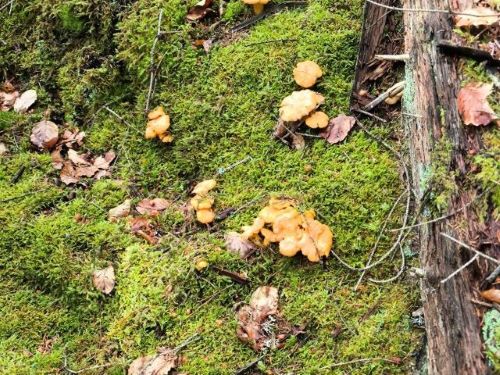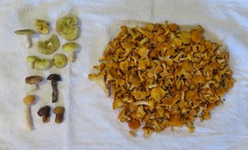 Wir sammelten viele Pfifferlinge, einige Trompetenpfifferlinge und einen Flockenstieligen Hexenröhrling.