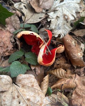 Foto: Die ersten Morchelbecherlinge 2025 begrüßen uns leider ein wenig unscharf. Typisch ist ihr Kontrast zwischen dem inneren Dunkel und der hellen Außenhaut. Auf dem 2. Foto zwei farbenfrohe Prachtbecherlinge, die sich besonders gut im Frühjahrswald mit seinen noch gedeckten Farben machen.