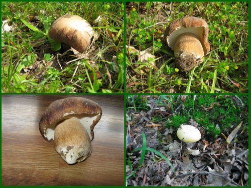 Collage 1: Neben dem Sommersteinpilz fand Michael den Narzissengelben Wulstling rechts unten. Er gehört wie der Fliegenpilz zur Gattung Amanita. Genau dessen Gifte enthält der Narzissengelbe Wulstling auch.