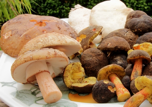 Foto: Ein schönes Foto mit Perlpilzen (links), Rotfußröhrlingen (rechts) und Anisegerlingen (hinten) hat uns Wiltrud zugesandt.