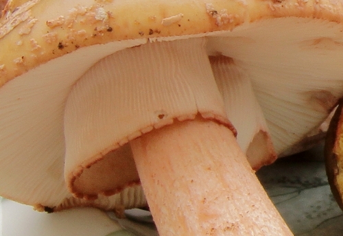 Foto: In Großaufnahme soll hier einmal die für Perlpilze charakteristische feine Riefung der Manschette herausgestellt werden. Sie ist ein sehr wichtiges Bestimmungsmerkmal zur Abgrenzung gegen den giftigen Pantherpilz, dessen Manschette (Ring) nie gerieft ist. (2 Fotos © Wiltrud)