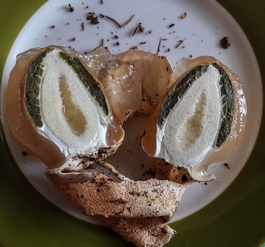 2 Fotos: Ein Hexenei, links im Querschnitt auf dem Teller, rechts im Wald. Diese Pilze aus dem Frühstadium der Stinkmorchel schmecken hervorragend! (2 Fotos © Christian M.)
