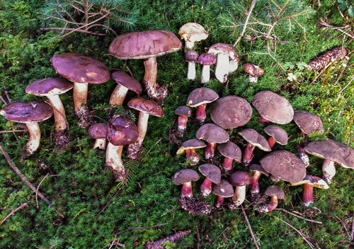 Foto: Sie ruhen sanft auf dem weichen Mooskissen: Maronenröhrlinge (links), Rotfußröhrlinge (rechts) und einige wenige Täublinge (oben rechts). (Foto © Christian)