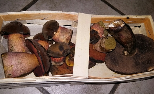 wuchsen. An diesem Fundort wuchs auch der überständige finstere Porphyrröhrling ganz rechts im Korb.