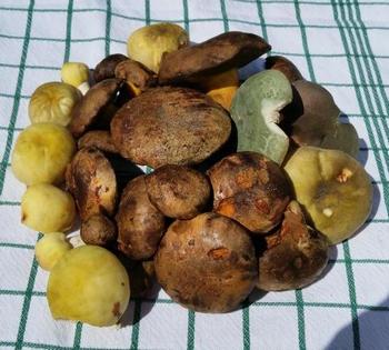 Schwarzblauende Röhrlinge, zwei Flockis, Semmelstoppelpilze und zwei der