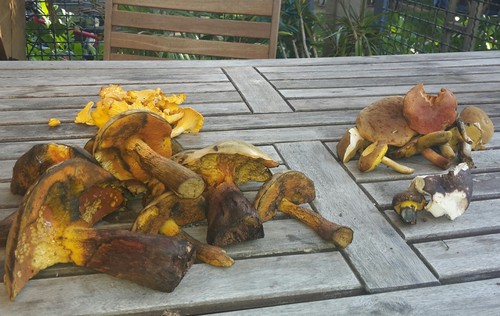 ich heute schon auf dem Heimweg von meinem Spaziergang war, fand ich - endlich - noch schöne Schwarzblauende Röhrlinge. Gestern fanden wir überwiegend Amethystpifferlinge. Auch wachsen viele kleine Pfifferlinge. Und immer wieder