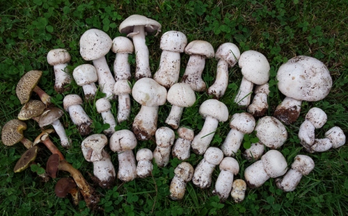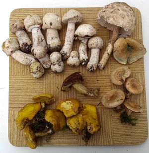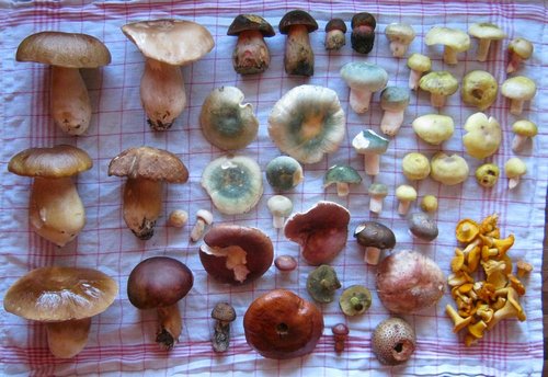 Foto: Wir sehen von links (oben) einen Fleischroten Speisetäubling, den Braunen Ledertäubling (zwei Mal), wohl zwei Grasgrüne Birkentäublinge und einen Rotstieligen Ledertäubling. Dazu Champignons, einen Reizker und den Rötlichen Gallerttrichter. (Foto © Christian)