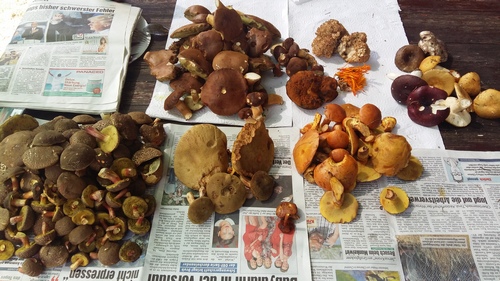 Massenweise Rotfußröhrlinge, Maronen, Steinpilze, Goldröhrlinge, Sandröhrlinge, einen Hexenpilz, die erste kleine Krause Glucke, etwas Ziegenbart, zwei Pfefferröhrlinge und ein paar Täublinge haben wir mitgenommen. Es wuchsen auch Gallenröhrlinge in Scharen.