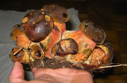 Foto: Eine Skulptur aus Flockenstieligen Hexenröhrlingen wie diese findet man nicht alle Tage. Sie ähnelt einem Büschel, das Michael bereits am 22. August 2013 gefunden hatte.