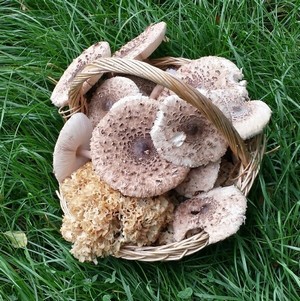 Foto rechts: Kerstins schön hergerichteter Korb ist leicht überladen. Eine Krause Glucke und etliche Parasolen übersteigen das Fassungsvermögen. (Foto © Kerstin)