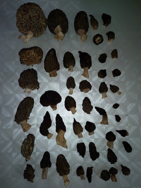 heute 46 Morcheln auf Rindenmulch, 40 Spitz- und sechs Speisemorcheln (Foto rechts). Manche waren frisch, andere bereits endgetrocknet, aber alle verwertbar. Die größte Speisemorchel wog 68, die größte Spitzmorchel 34 Gramm.
