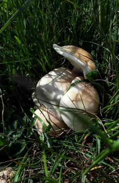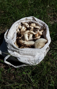 2 Fotos: Die beste Qualität an Maipilzen stand im Gras! Einen ganzen Stoffbeutel voll hat Christian gesammelt. Die Nachbarn waren dankbare Adressaten. (2 Fotos © Christian M.)