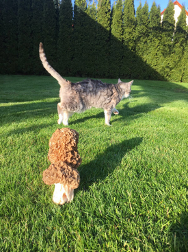 Foto rechts: Katerchen will mit der ganzen Sache nichts zu tun haben und schleicht sich. Er weiß, dass die zwei dicken Speisemorcheln hier nur fürs Foto posieren, denn mit Sicherheit wuchsen sie woanders als auf diesem gepflegten »englischen« Landschaftsrasen.