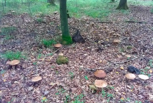 Foto: Ein Hexenring aus Sommersteinpilzen - das hat die Welt noch nicht gesehen. Man beachte den kreisförmigen Verlauf der Pilze rechts vom Baumstamm und dahinter. Michael hat einmal mehr alle Rekorde geschlagen.