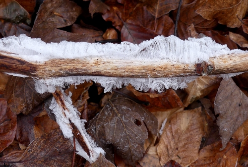 wir waren heute am Lech bei Mundraching spazieren. In einigen Jungwaldbeständen mit Buchen konnten wir wieder einmal das Haareis bewundern. Für uns ungewöhnlich, fanden wir die im Volksmund auch »Engelshaar« genannte Eisbildung nicht nur an Ästen auf dem Boden, sondern teilweise auch im Gezweig der Bäume.