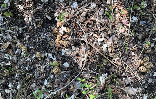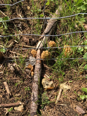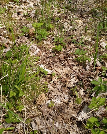 Auf meinem Rundkurs gab es wieder ein knappes Kilo bester Grauer Speisemorcheln, von denen 8 Stück, wie auf dem Foto rechts zu sehen, gesellig beieinander wuchsen, und ein paar Gelbe Speisemorcheln. Die Spitzmorchel-Plätze haben dagegen ihren Dienst für dieses Jahr wohlverdient eingestellt.