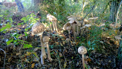Foto: Ist das ein Parasolengewimmel im Unterholz! Wer genau hinschaut, sieht auch hinten links und rechts am Bildrand noch Riesenschirmlinge. Ein charakteristisches Foto für die unvorstellbare Zahl an Riesenschirmpilzen, die dieses Jahr ganze Landstriche gut beschirmt haben. (Foto © Manuela)