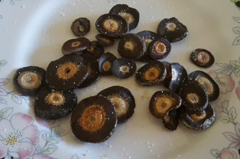 Foto: Die gebratenen Scheiben des Inneren vom Hexenei sind aufgetischt. Sandro hat die olivgrüne Umgebungsschicht des Pilzzentrums mitgegessen, was nicht unüblich ist, siehe hier und hier (Tageseintrag 17. Juni 2019). Die französische Gourmetküche verzichtet darauf und bereitet nur das innere Weiße zu, siehe hier und hier (Tageseintrag 8. Juni 2020). (3 Fotos © Sandro)