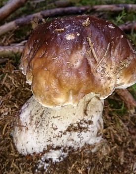 "Heute, am 4. Oktober, habe ich bereits am Weg aus dem Auto heraus vier Steinpilze erblickt. Nach kurzer Suche im Laub-/Buchenwald waren 11 Steinpilze gefunde, unter anderem zwei riesige Exemplare, kerngesund und ohne Wurm.