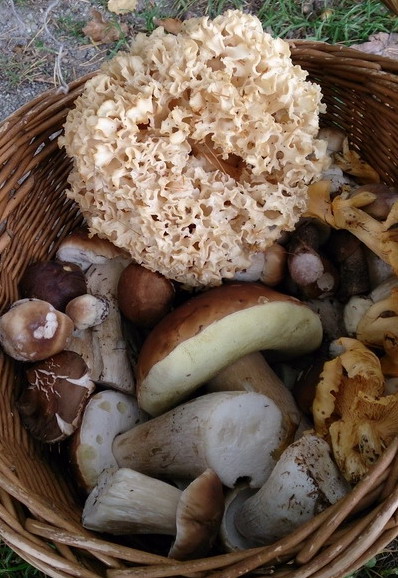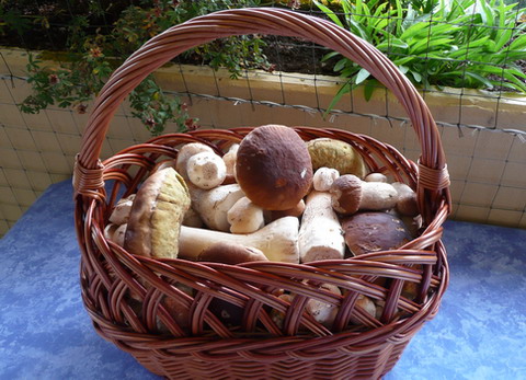 Foto rechts: Beste Speisepilze zeigt Armin in seinem Korb. Alle vertretenen Pilzarten versprechen ein herrliches Esserlebnis.