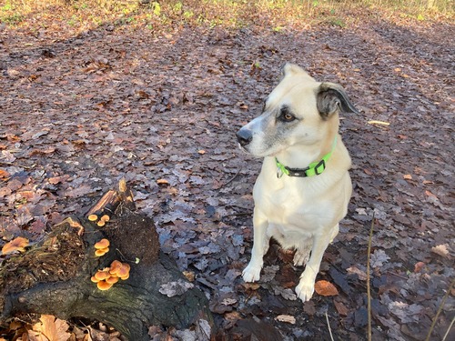 Foto: Die Samtfußrüblinge blieben zur Freude nachfolgender Spaziergänger stehen. Vlore begutachtet sie vor dem Weitermarsch noch kurz. (Foto © Andreas)