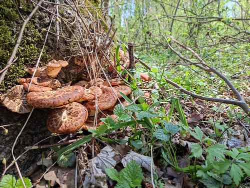 Speisemorchel 2022. Ein prächtiger Schuppiger Porling schloss den Morgenspaziergang ab. Na, das ist doch ein Osterfest!