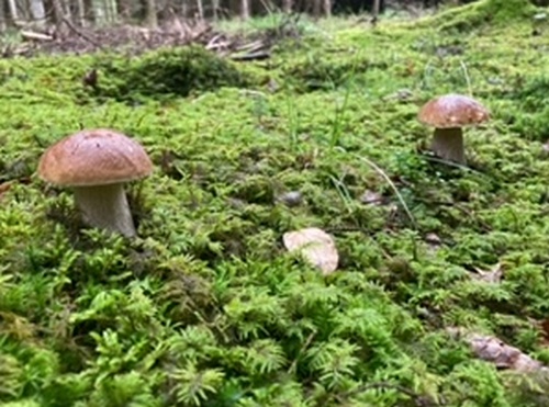 Foto: Ein Blick in das Suchgebiet von Jessika & Mitsammlern. Wir sehen einen Fichtenwald, der im hinteren Teil bemoost ist. Hier wuchsen, wie das Bild rechts zeigt, die schönen wurmlosen Rotfußröhrlinge.
