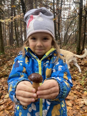 So müsste es im Herbst auch mit den Steinpilzen zugehen. Die muss sie - auf langen Wegen - im südlichen Steigerwald suchen...