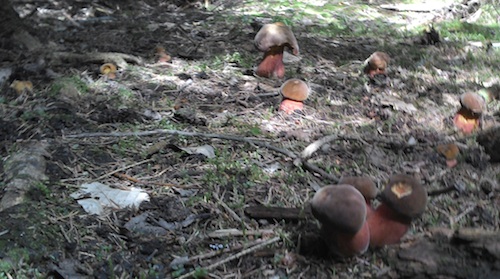 Foto: Auf ein ganzes Nest von Flockenstieligen Hexenröhrlingen stießen Svenja und Andreas. Sie wachsen gerne gesellig. Elf Pilze sind hier zu erkennen.