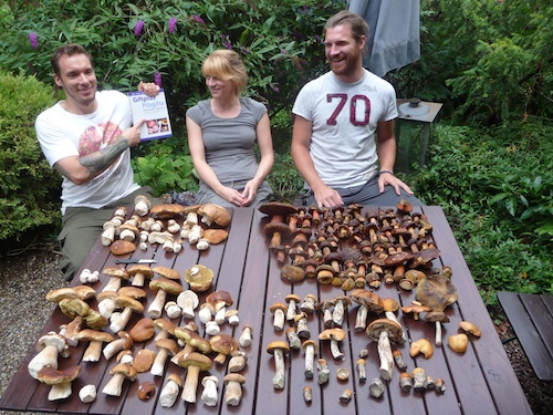 Foto: Andreas mit Schwester und Schwager (von links) - und viele, viele herrliche Pilze. Fein gesäubert, sorgsam sortiert. Welch ein Anblick, und das Ende Juli! Solch eine frühe ergiebige Lese gibt es wahrhaftig nur alle Jubeljahre. Und die Rhön macht ihrem Ruf als klassische Pilzregion alle Ehre! Herzlichen Glückwunsch und ebensolchen Dank für die Zusendung! (Foto © Fam. Gehrold/privat)